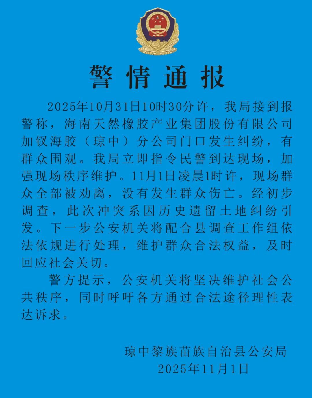 2025年10月31日10时30分许,我局接到报警称,海南天然橡胶产业集团股份有限公司加钗海胶(琼中)分公司门口发生纠纷,有群众围观。我局立即指令民警到达现场,加强现场秩序维护。11月1日凌晨1时许,现场群众全部被劝离,没有发生群众伤亡。经初步调查,此次冲突系因历史遗留土地纠纷引发。下一步公安机关将配合县调查工作组依法依规进行处理,维护群众合法权益,及时回应社会关切。